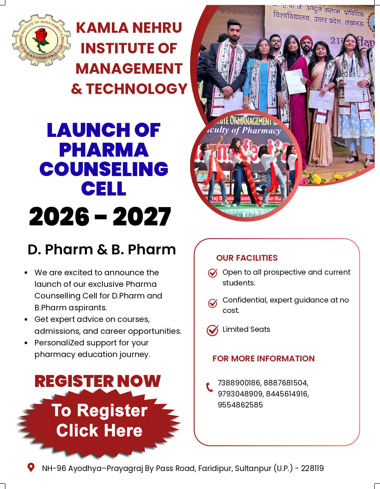 In today’s scenario, we at KNIMT feel ourself fortunate enough to have such a wonderful institute for imparting health care education to those willing students who know exactly what is their career interest. It is necessary that the doors of Pharma education should be open to all for the development of the nation. In 2004 Kamla Nehru Institute, Sultanpur put up an effective step in the field of Pharmaceutical Education by establishing a new Institution named KNIMT Faculty of Pharmacy, Faridipur, Sultanpur. This Institute is the need of rural youth of the surrounding areas. Since then we have been striving hard to meet all the global demands of worldwide technology. Every year we achieve new goals of success in various fields alongwith education. - Read More